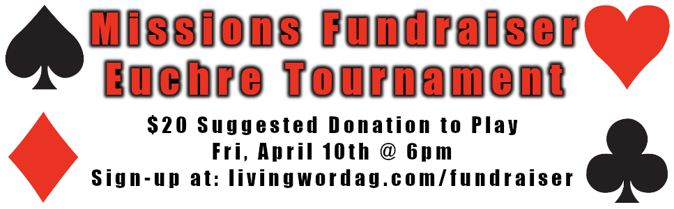 Join us at Living Word on Friday, April 10th at 6pm for our 2nd annual Euchre Tournament! This is a Fundraiser event for our upcoming Missions Trip to Las Vegas.
